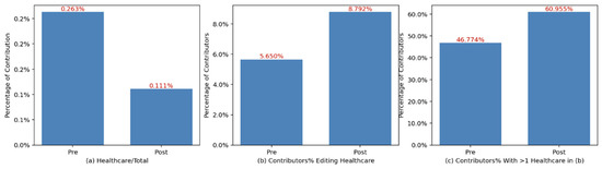 Among contributors with at least one healthcare amenity-related edit, the absolute number of healthcare edits increased in the post-COVID-19 period (Figure 5c,d). However, due to a larger increase in total edits, the mean proportion of healthcare edits among total edits decreased from 0.263% pre-COVID-19 to 0.111% post-COVID-19 (Figure 6a). Nonetheless, a larger proportion of contributors edited healthcare amenities in the post-COVID-19 period (8.792%) compared to the pre-COVID-19 period (5.65%) (Figure 6b). Furthermore, among contributors who made at least one healthcare edit, a higher percentage contributed more than one healthcare-related edit post-COVID-19 (60.955%) than pre-COVID-19 (46.774%). Overall, these results suggest that the observed decrease in the proportion of healthcare edits relative to total edits is not due to reduced attention on healthcare amenities. On the contrary, contributors who edited healthcare amenities became more actively engaged in these contributions in the post-COVID-19 period.