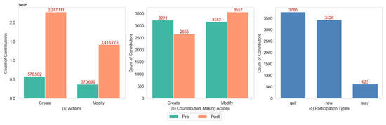 Participation metrics in the pre- and post-COVID-19 period. (a) Number of creation and modification edits by all contributors; (b) number of contributors who made creations and modifications; (c) number of contributors in each participation status type.