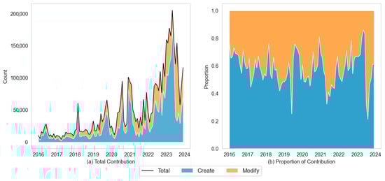 The total number of both modifications and creations increased after the COVID-19 outbreak, leading to a substantial rise in overall contribution. The proportion of creations generally remained around 60%, with greater fluctuation observed after 2020. Figure 8a further supports this observation, showing that although the total number of both creations and modifications increased over time, creations consistently outnumber modifications within each time period.