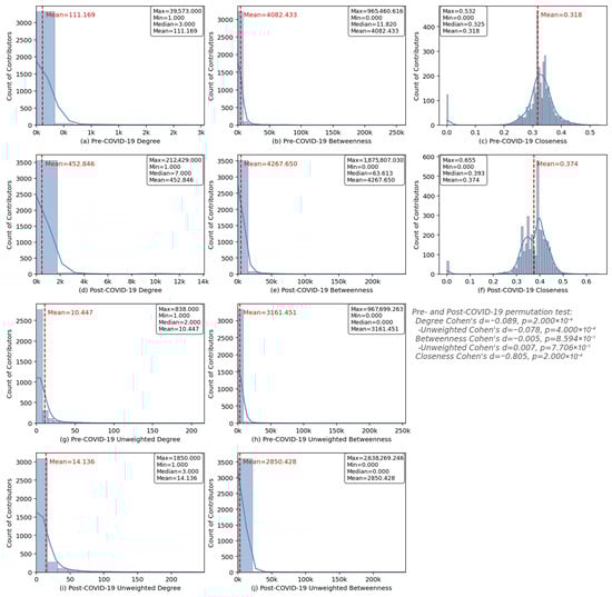 Frequency distribution of the social metrics in pre- and post-COVID periods. (a,d) Weighted degree for individual contributors; (b,e) weighted betweenness for individual contributors; (c,f) closeness for individual contributors; (g,i) unweighted degree for individual contributors; (h,j) unweighted betweenness for individual contributors.