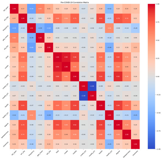Pre-COVID-19 cross-correlation matrix (Pearson Correlation Coefficient). Blue color represents negative correlation. Red color represents positive correlation. The darker color represents stronger correlation.