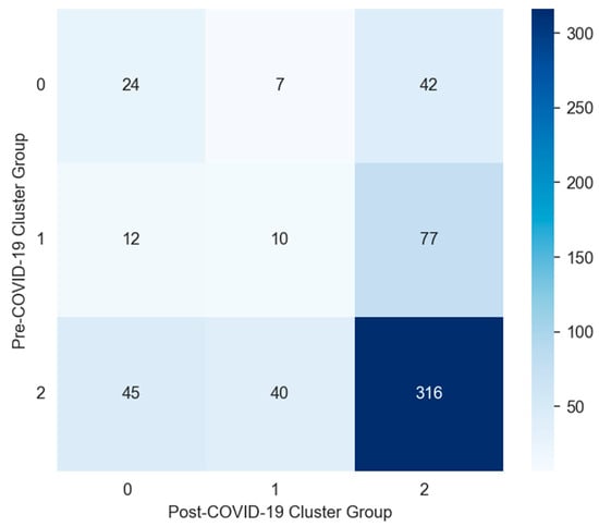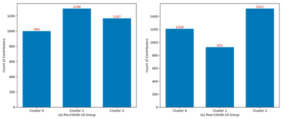 The fitted K-Means model was also applied to classify contributors in the post-COVID-19 period. Each contributor was assigned to a cluster group based on their contribution patterns as measured by the metrics. The cluster membership of contributors who were new (contributed only in the post-COVID-19 period), quit (contributed only in the pre-COVID-19 period), or stayed (contributed in both time periods) were compared, based on the number of contributors in each engagement status within each cluster. For stay contributors, cluster memberships in the pre- and post-COVID-19 periods were compared to identify changes in contribution patterns after the COVID-19 outbreak.
