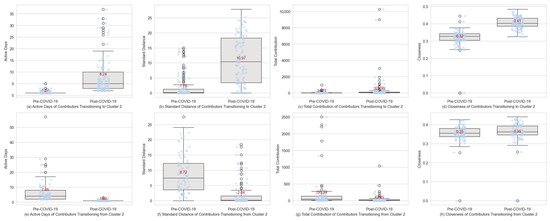 Table 1 presents the metrics used to quantify individual contributors’ behavior. These metrics capture contribution behavior from temporal, spatial, thematic, and participation perspectives. Temporal metrics assess how long and how frequently individual contributors engage in data contribution [36,84,85]. Spatial metrics quantify the area of contribution using the standard distance [86]. Thematic metrics focus on healthcare-specific contributions made by individual contributors. Participation metrics evaluate the quantity and type of contributions (creation or modification) made by each contributor, and indicate engagement status in pre- and post-COVID-19 periods (contributions made in only one period or both periods) [87]. Social metrics measure the co-editing interaction centrality and connectivity of individual contributors [88,89].