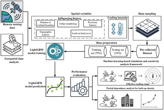 The densities of bareland, built-up area, and green space are used to characterize urban morphology. The proximity-based features consist of distances from rivers, lakes, and coastlines. The compiled spatial dataset is then split into training (70%) and testing sets (30%). The first set is used to train a LightGBM model; the second set is reserved to evaluate the model’s predictive capability. The trained machine learning model is subsequently used to perform a sensitivity analysis that estimates the effective cooling range around wetlands. Finally, partial dependence analysis with built-up density is conducted to interpret model behavior and to reveal how surrounding urban development affects the wetland’s cooling intensity.