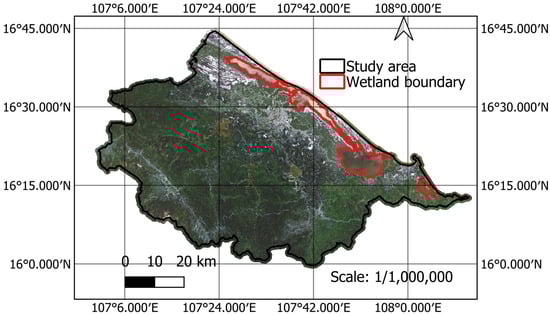 The study area and wetland boundary (true color composite Sentinel-2 imagery). Data source: European Union/ESA/Copernicus.