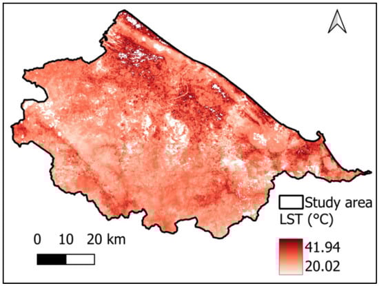 Furthermore, a robust statistical procedure was applied to the LST data to characterize typical thermal conditions in the study area and reduce the influence of anomalous values as well as infrequent extremes. Specifically, the empirical distribution of all LST pixels over the study period was examined, and pixels with values below the 1st percentile or above the 99th percentile were treated as potential anomalies or outliers and excluded from subsequent analysis. Accordingly, only pixels with values in the range [20.23 °C, 42.35 °C] were retained. In other words, this procedure preserves the central 98% of the empirical LST distribution and discards the lowest 1% and highest 1% tails. Figure 3 presents the final LST in the study area from 1 March to 31 July 2025.