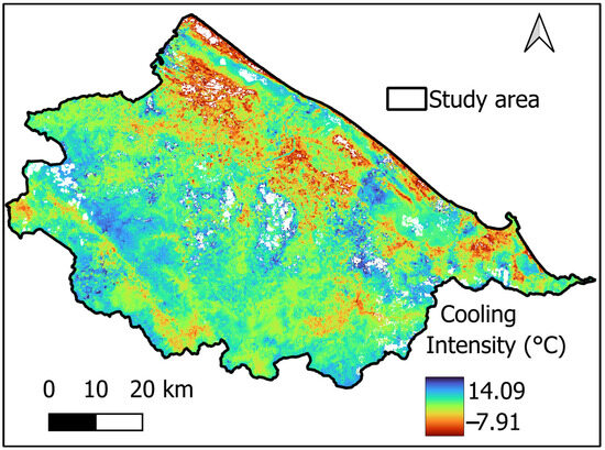 This zonal mean serves as a reference temperature against which the cooling performance of the studied wetlands is evaluated. The cooling intensity at any pixel is therefore interpreted as how much cooler (positive values) or warmer (negative values) that pixel is relative to , that is, relative to the average thermal conditions of the combined bare-land and built-up surfaces. Based on the aforementioned zonal operation combining the LULC and LST maps, the mean LST of all bare-land and built-up pixels was found to be 34.09 °C. Accordingly, the cooling intensity map for the study area is illustrated in Figure 5.