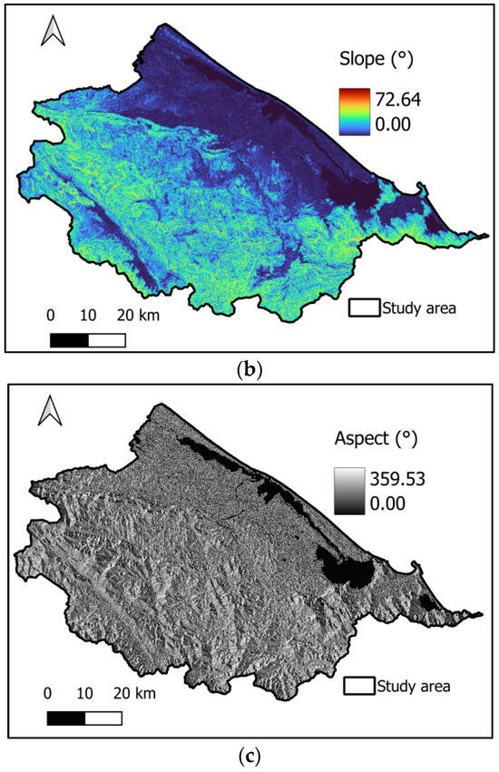 Topographical features: (a) elevation, (b) slope, and (c) aspect.