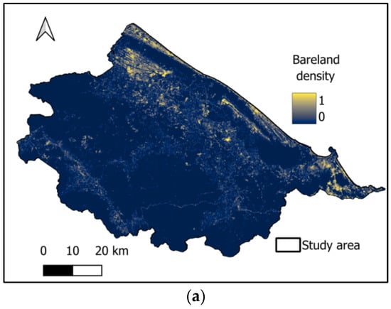 Urban morphological features: (a) Bareland density, (b) built-up density, and (c) green space density.