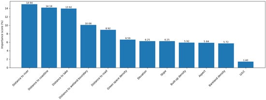 The local urban context plays a vital role in determining the cooling intensity of wetlands, as surrounding landscape elements and anthropogenic structures jointly influence the spatial patterns of LST. Nearby lakes can provide additional sources of evaporative cooling, reinforcing the thermal moderation effect produced by wetlands. Similarly, proximity to coastlines often contributes to lower air and surface temperatures due to the sea–land breeze circulation and the high heat capacity of water bodies. Moreover, nearby rivers may also enhance the overall cooling performance of wetlands by expanding the area of moisture exchange and the cooling associated with evaporation from water surfaces. In contrast, infrastructures such as road networks tend to introduce considerable anthropogenic heat through vehicle emissions and thermal radiation from pavement materials. Therefore, this study incorporates proximity-based variables of distance to lake (Figure 8a), distance to coastline (Figure 8b), distance to river (Figure 8c), and distance to road (Figure 8d) to capture the combined effects of hydrographic influences, background cooling potential, and heat sources within the surrounding urban landscape. In addition to the aforementioned variables, distance to wetland boundary is used to characterize how the intensity of wetland-induced cooling varies with increasing separation from the wetland edge. This variable enables the analysis to capture the spatial variation in cooling benefits and to quantify the extent to which wetlands can effectively mitigate the heat stress in their surrounding areas.