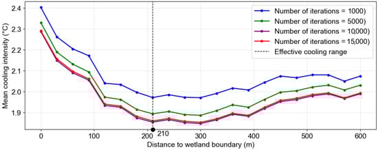 This process yields one cooling curve per simulation. For each predicted cooling curve, a moving average with a smoothing window of 3 is applied to reduce small, noisy fluctuations so that only meaningful changes in cooling intensity can be recognized. This window length was chosen to smooth minor point-to-point variations while preserving the overall shape of the cooling profile. After a specified number of simulations (N), all the cooling curves are then subsequently combined to compute a mean cooling profile. The framework then analyzes the mean cooling profile to locate the first local minimum. To eliminate minor fluctuations in the profile, a local minimum is considered valid only if it represents a drop of at least 0.1 °C from the highest smoothed value observed so far. This threshold is chosen to distinguish meaningful local minima from negligible variation. The corresponding distance on the grid is interpreted as the effective cooling range. In other words, this is the distance beyond which the marginal cooling effect of the wetland becomes substantially weaker. Although the chosen framework parameters (30 m distance step, smoothing window of 3, and 0.1 °C drop threshold) are reasonable for the present study, the estimated effective cooling distance may vary to some extent if different parameter values are adopted.