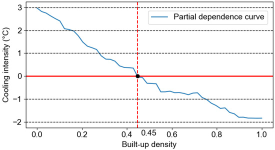 LightGBM can help attain good predictive accuracy due to its efficiency in handling large datasets and complex nonlinear relationships. Nevertheless, as a tree-based ensemble approach, LightGBM operates as a black box. This fact brings about difficulties in interpreting the individual effect of an input feature. To address this issue, a partial dependence plot (PDP) [80] can be used to visualize how one selected predictor influences the model’s predicted cooling intensity while averaging the effects of all other variables. By illustrating the marginal relationships between a predictor and a target variable, a PDP provides valuable insights into the underlying behavior of the LightGBM model. In this study, the PDP analysis was conducted using the scikit-learn library [81]. We rely on a PDP to evaluate the effect of built-up density on the cooling performance of wetlands.