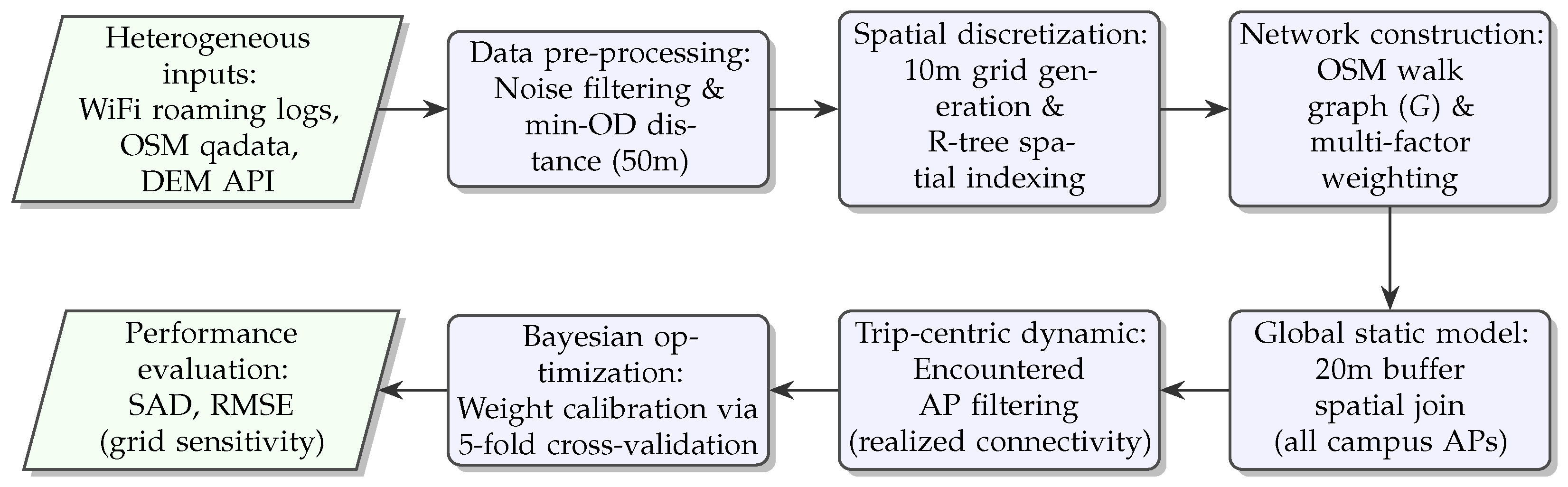 Figure 2). The framework integrates heterogeneous data sources, including OSM, Digital Elevation Models (DEM), and WiFi roaming logs, as summarized below: