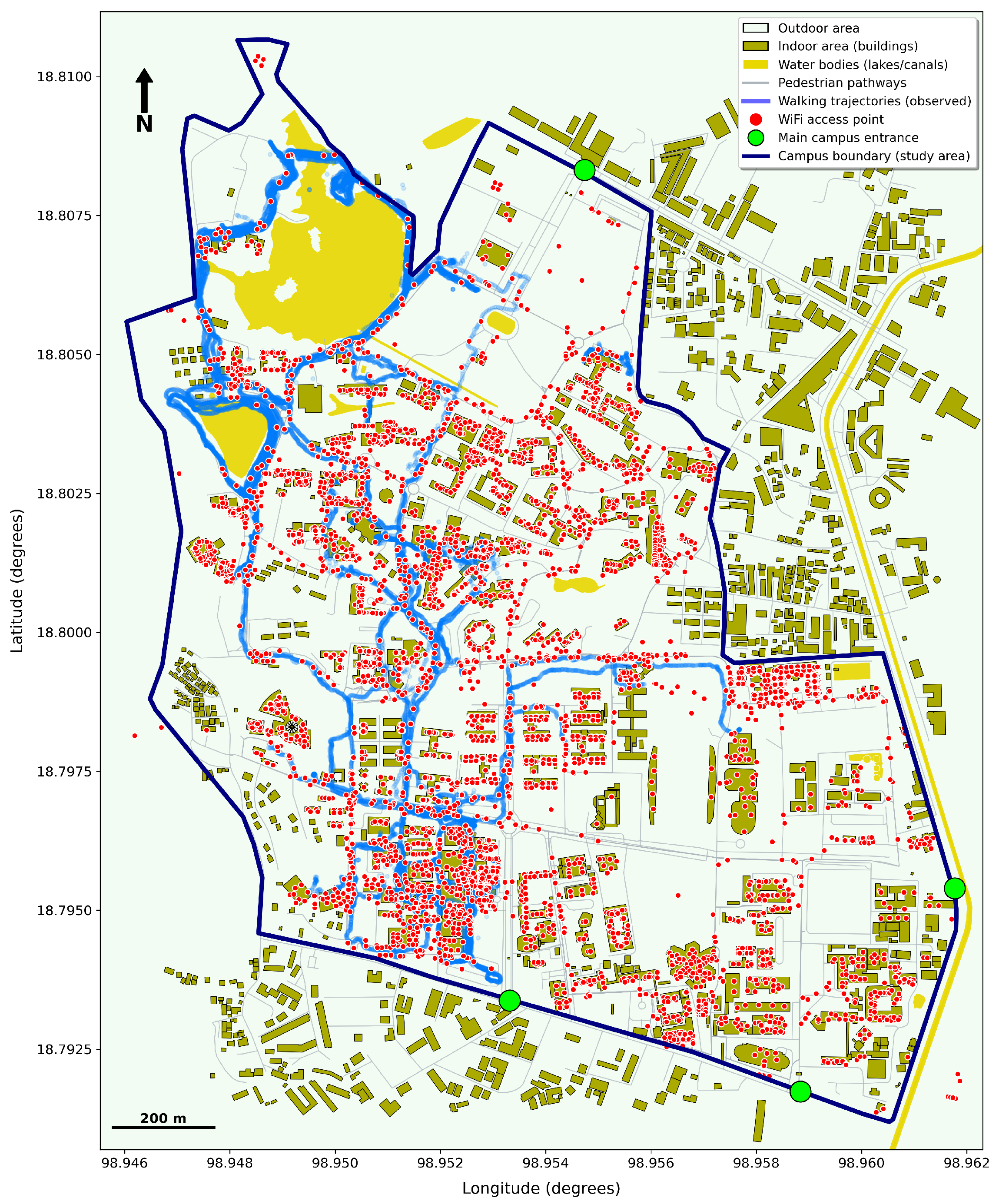 The empirical analysis in this study was conducted on the main campus of Chiang Mai University (CMU), Thailand. The campus represents a dense, digitally connected academic environment that combines extensive pedestrian infrastructure with large-scale wireless network deployment. Covering approximately 14.25 square kilometers, the campus contains academic buildings, residential areas, administrative facilities, and open public spaces connected through a complex network of pedestrian pathways and road segments.