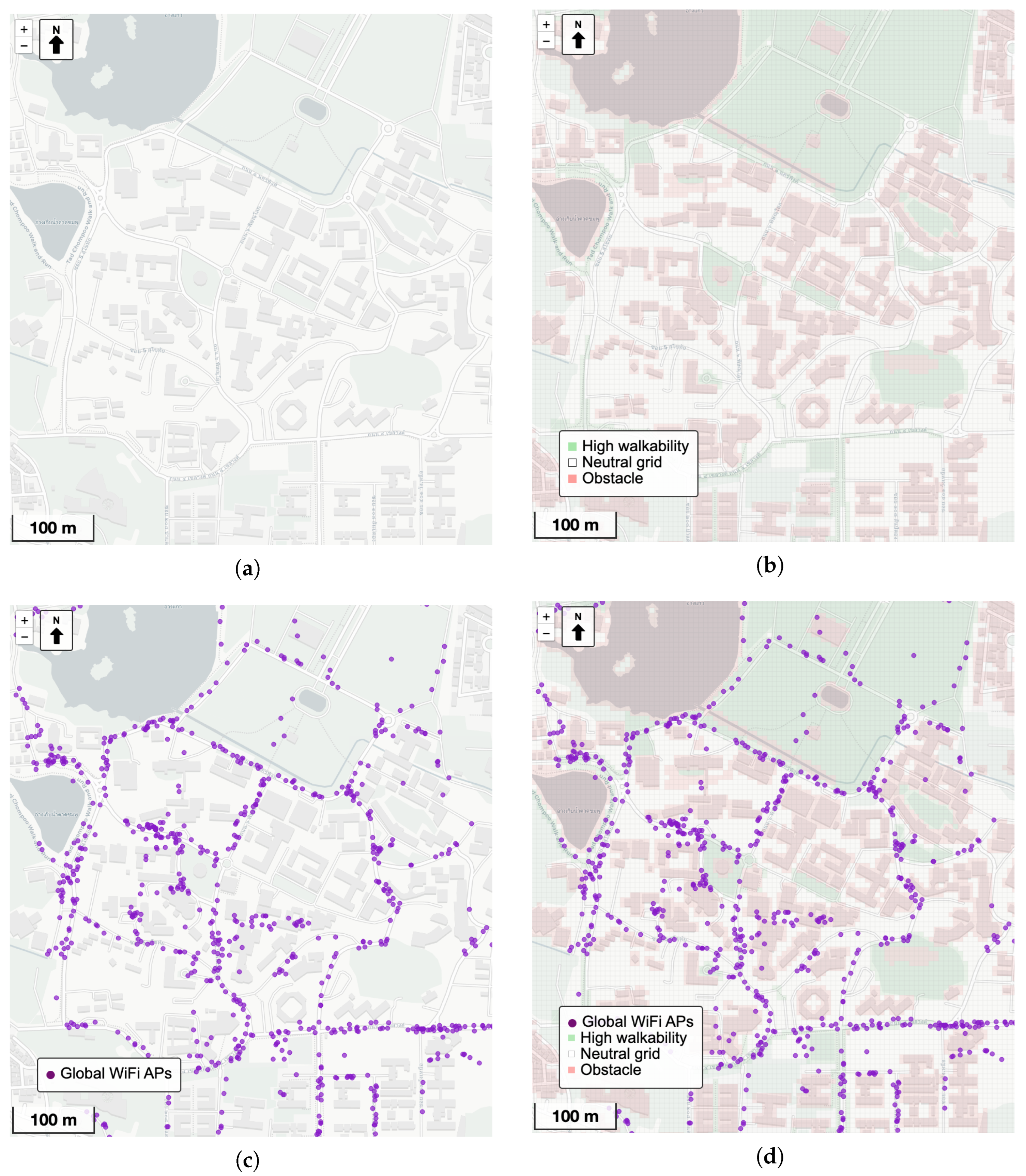 In addition to infrastructure-based environmental grids, future work may integrate street view imagery and computer vision techniques to enrich the walkability layer with perceptual and semantic features. Recent advances in automated walkability audits using street view semantic segmentation [