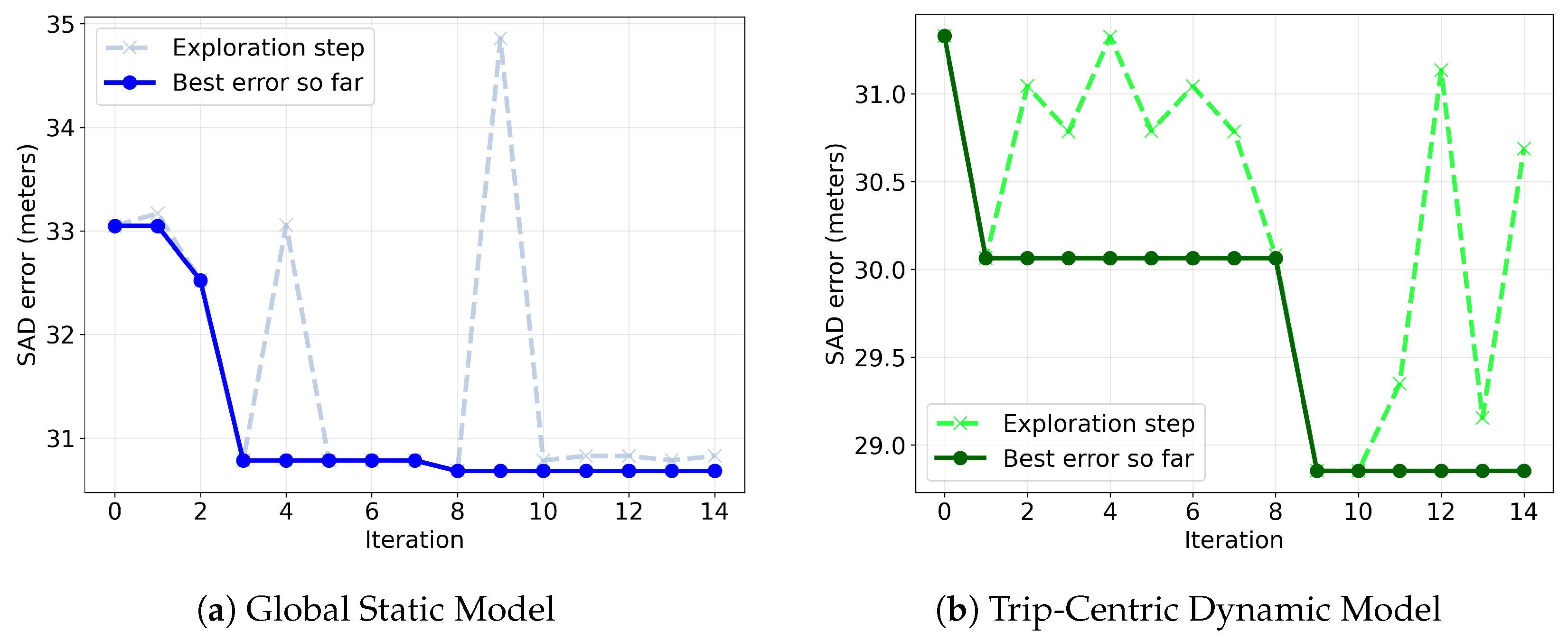This process was repeated for both the Global Static Model (Model A) and the Trip-Centric Dynamic Model (Model B) to facilitate a direct performance comparison. The convergence of the optimization process across iterations is visualized in