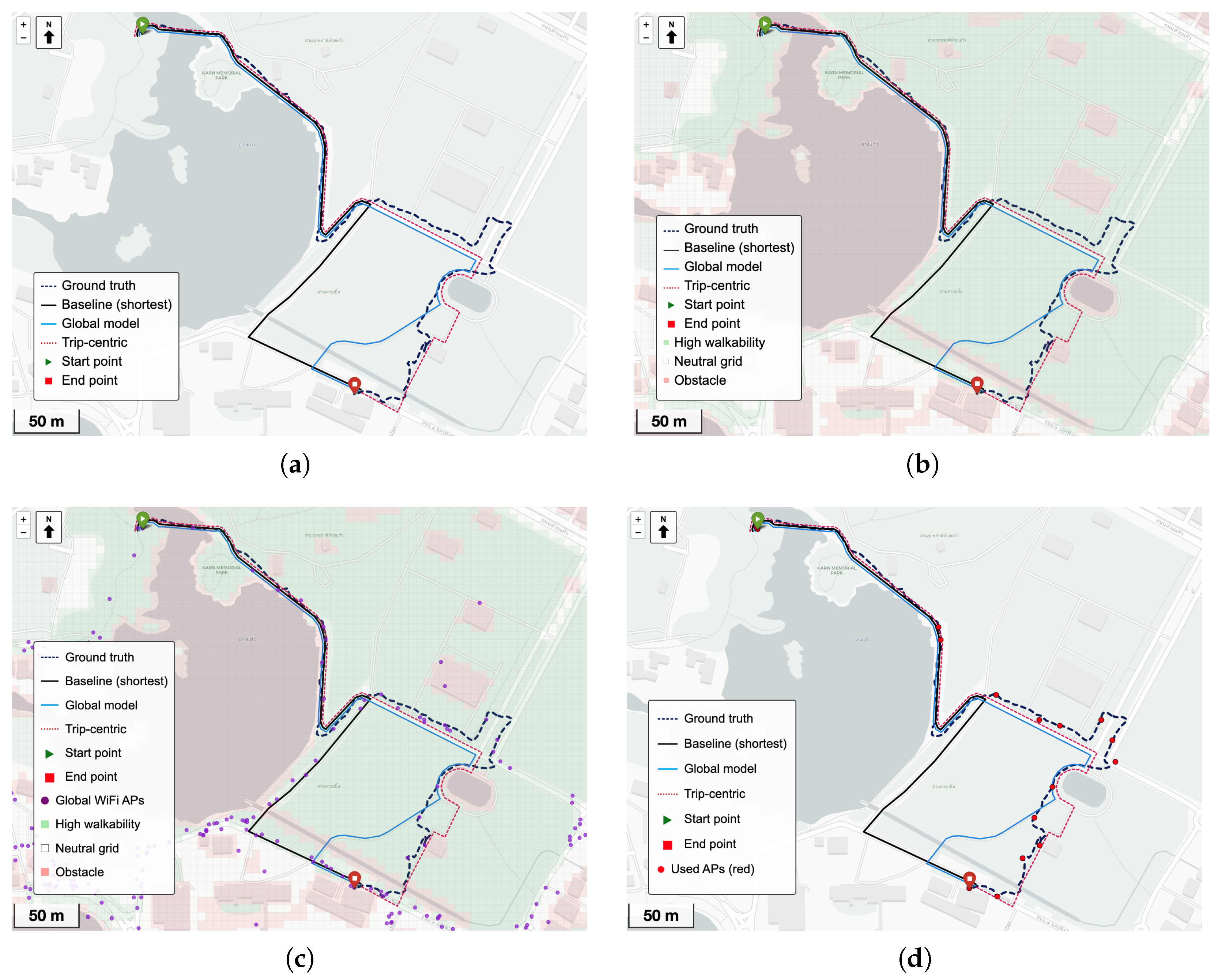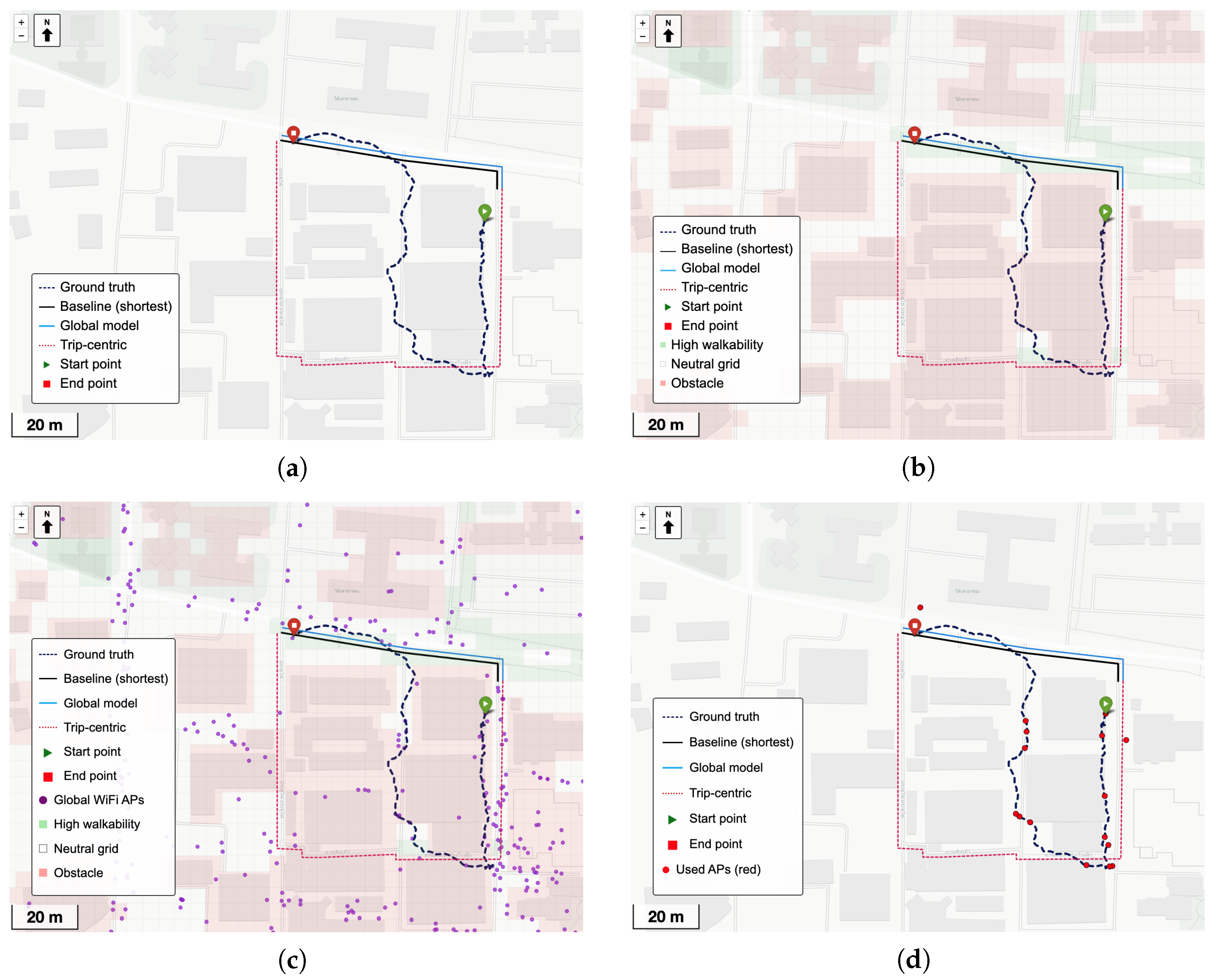 Figure 7d, the set of access points with which the device actively associated during the trip is considerably sparser and does not support the central route implied by the global map. Incorporating this trip-specific context, the model correctly infers a peripheral detour that aligns with the user’s movement, achieving a reconstruction error of
