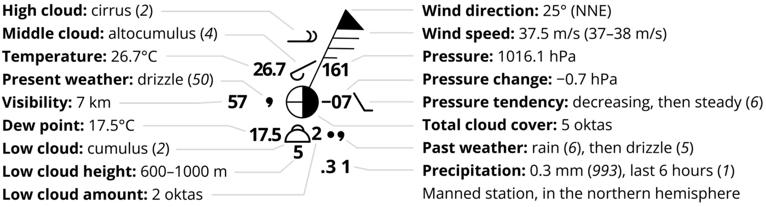 Figure 1, according to Attachment IV (“Graphical Representation of Data, Analyses and Forecasts”) of the document, the graphical representation of surface observations is accomplished with a surface-plotting model symbol. This symbol positions its subelements on predefined locations in a grid-like layout, around a central station circle. The standard requires the elements to be placed in the relative positions given, while allowing for omission of non-plotted elements. The station model includes both numerical elements with direct values for quantitative data and graphical/symbolic elements primarily for qualitative data. In general, station model symbols can display large amounts of observational surface station data in a concise, visually organized way. With these symbols, meteorological variables like cloud cover, wind direction, wind speed, temperature, pressure, pressure tendency, weather phenomena, cloud types in different altitudes, precipitation, and others can be effectively communicated simultaneously. The central, total cloud cover circle is referenced to the reporting station’s actual location, where the observation was made. In their products, meteorological organizations of countries might apply the WMO coding and representation with slight variation (for example, [