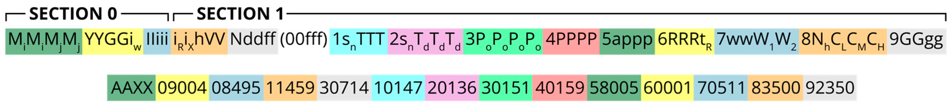 6], sections 0 and 1 only. The example given in the figure is a synoptic observation made at station Gibraltar North Point (WMO station ID 08495) [