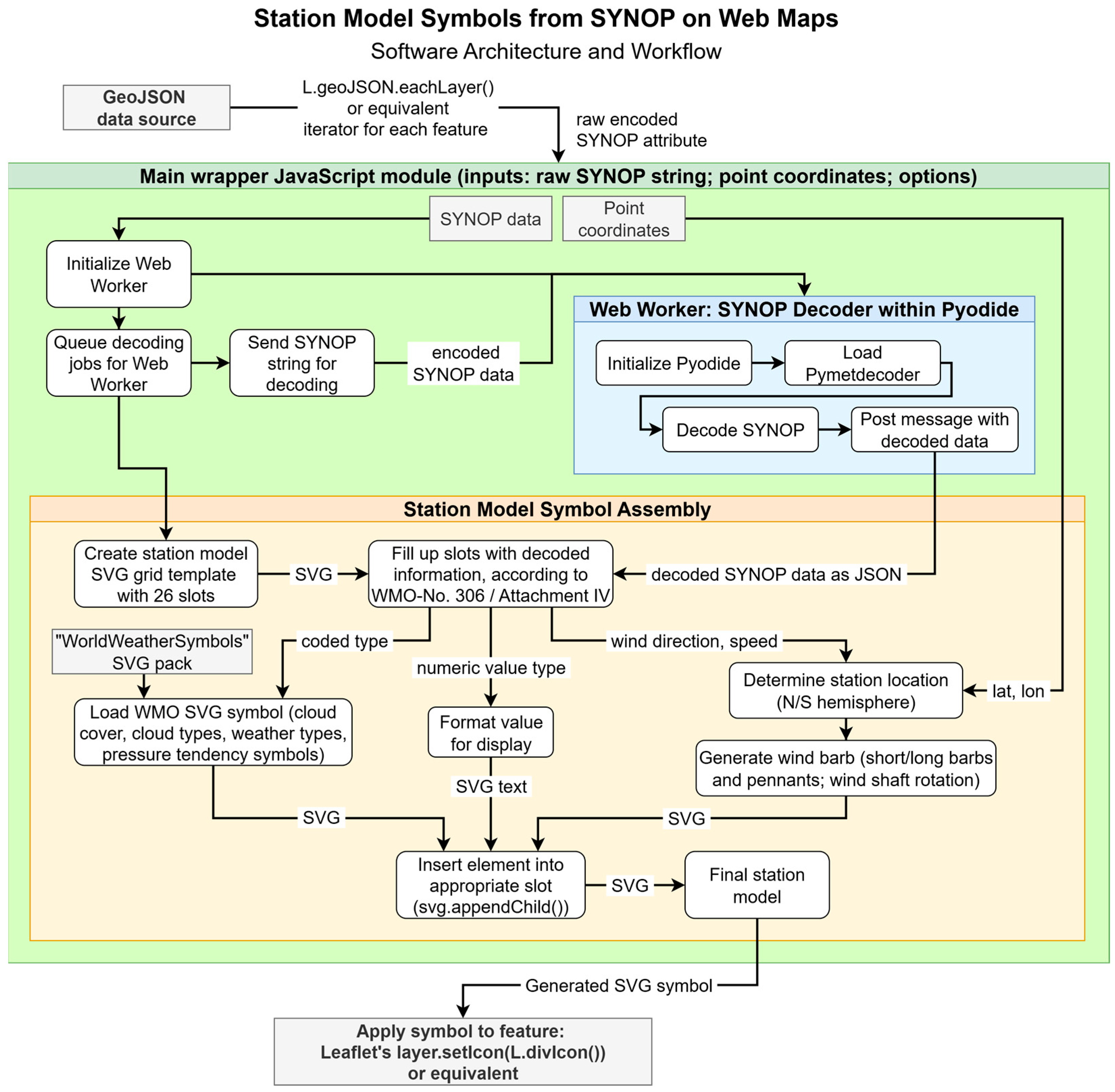 This study presents an open-source JavaScript module that can generate WMO-compliant station model symbols in SVG vector format on the client-side, which eases the creation and publishing of synoptic surface weather charts in web environments. The introduced module makes use of the Web Workers API and handles both SYNOP data decoding and dynamic generation of symbols, offering a streamlined and customizable experience. Its output is compatible with popular web mapping libraries, like Leaflet and OpenLayers. Due to its client-sided nature, the module can also easily be implemented in a dynamically updated server–client architecture. To address aspects like visual clarity, symbology legibility, and the potential exclusion of users who do not have the required visual capabilities to interpret such dense symbols, the developed module provides two means to the map designer: global symbol scaling and font scaling for numerical values. With well-defined defaults, the station models produced by the module remain legible on maps with a moderate density of spatial distribution. A brief discussion is given on the module’s performance, limitations, and possible further optimizations. After the initialization of the Pyodide environment in 2–2.3 s on the client-side, the module decodes individual SYNOP reports and assembles their respective station model symbols in 1–2 ms. In the future, the primary improvement with the greatest benefits in performance would be utilizing a native JS library to decode SYNOP reports, as such a library was not available at the time of conducting the study. This discussion also touched on adjusting the wind shaft symbol to support commonly used conformal projections with curved lines of latitude to keep true direction. It also mentioned the potential benefits of generating station model symbols entirely on the server-side instead, and supporting the modern, binary BUFR format as data input in the future.