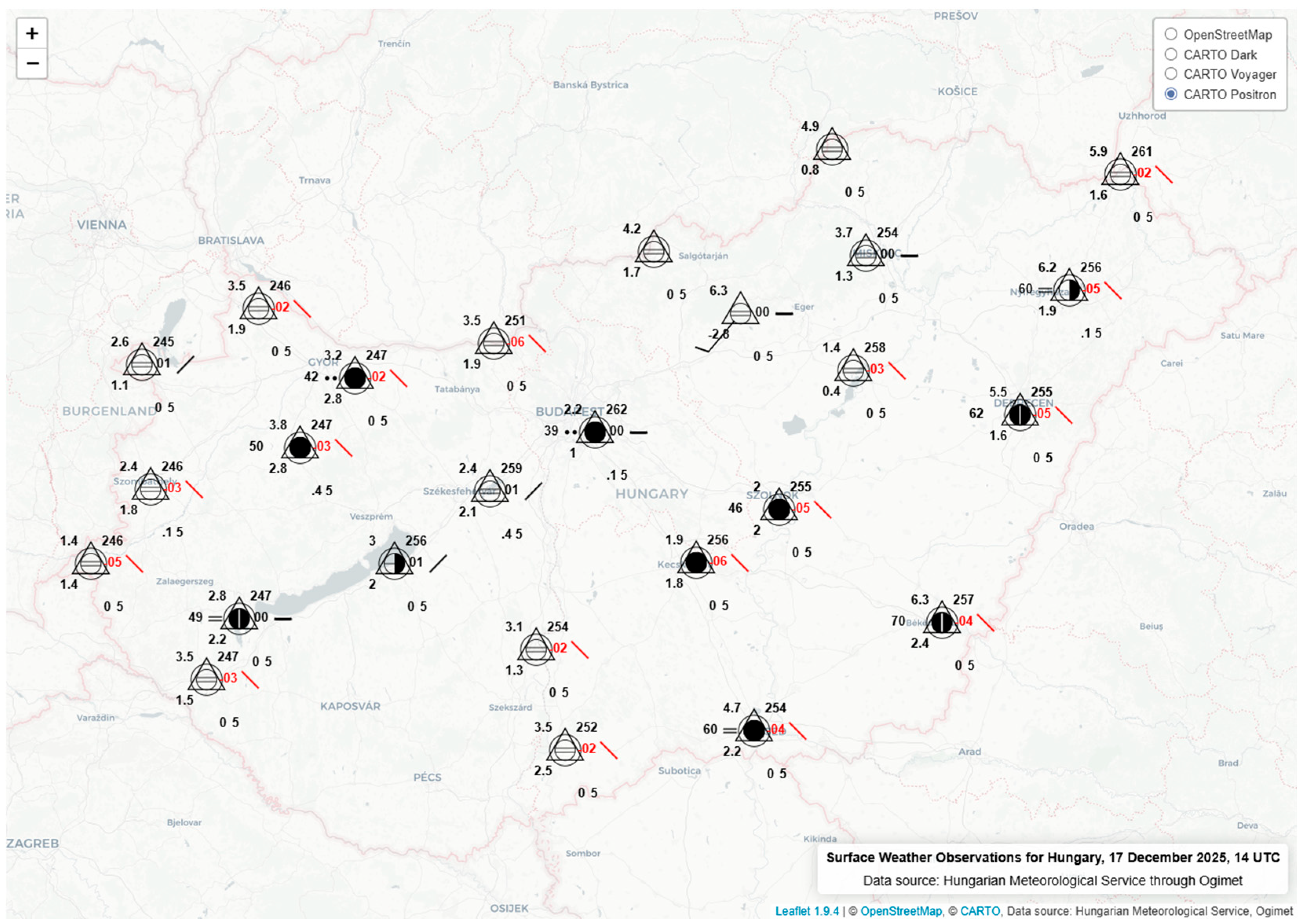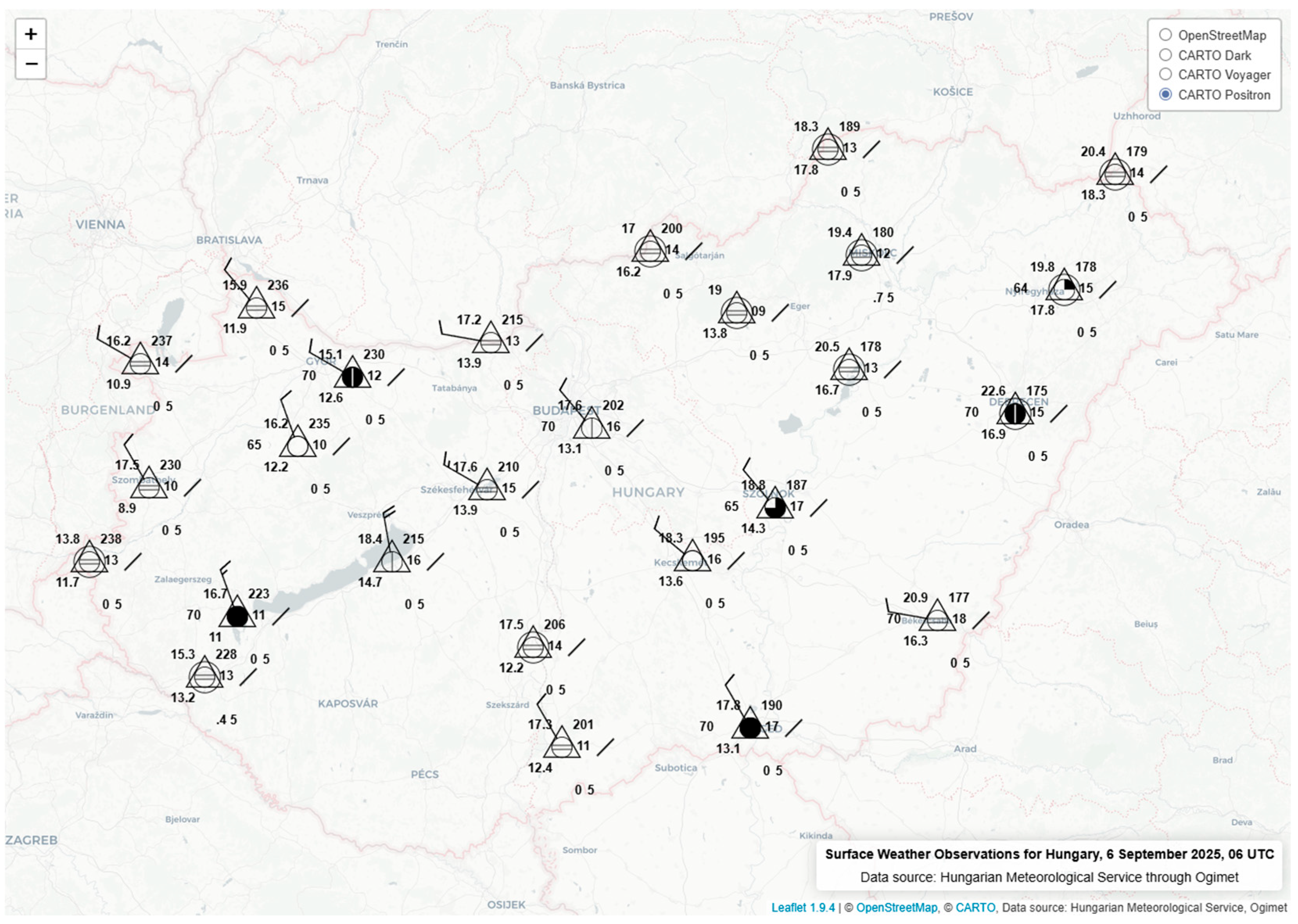 Figure 12, surface weather observations for Hungary are presented on a web map, utilizing the developed module to dynamically generate symbology. The two maps visualize data for two specific points in time, 6 September 2025 06 UTC and 17 December 2025 14 UTC, respectively.