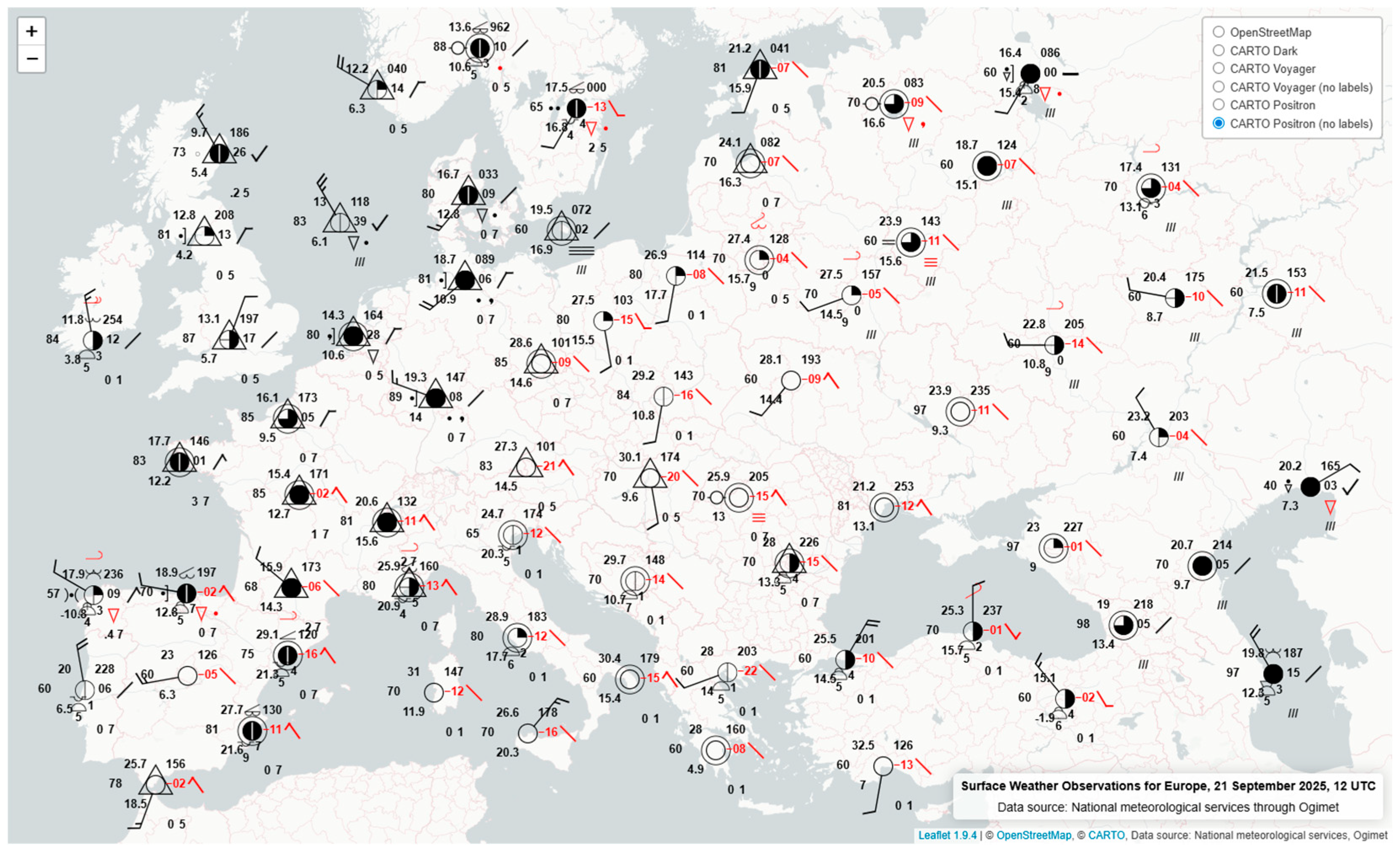 43]. For all web map examples, the SYNOP data from Ogimet was manually retrieved and transformed into a GeoJSON file as an attribute for point features, representing the locations of the respective weather stations. The examples use a compilation of meteorological data retrieved from Ogimet, for the given timestamp (if available), provided by individual national meteorological services and institutes across Europe. The web map examples can be found on the GitHub project page.