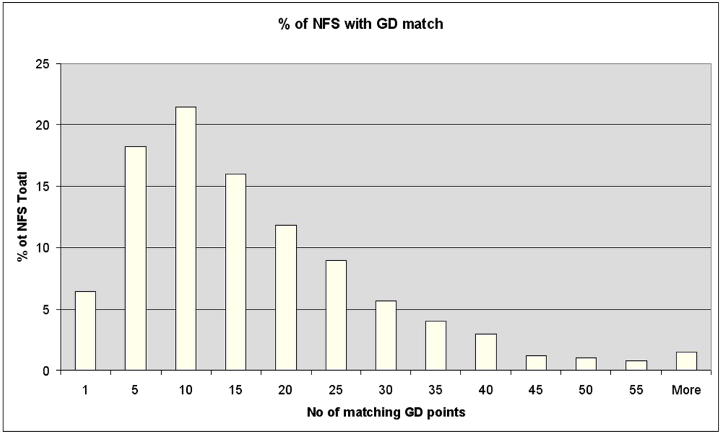 Figure 2, are reported the percentage of NFS addresses that automatically match with a given number of buildings in the GD. We can see that only 6% of NFS addresses match on a one-to-one basis with a GD building, the rest match against a range of numbers of buildings, with NFS addresses matching to 10 GD buildings on average. It should be noted that this is not an “error” as all 10 of the buildings in the GD have exactly the same address.