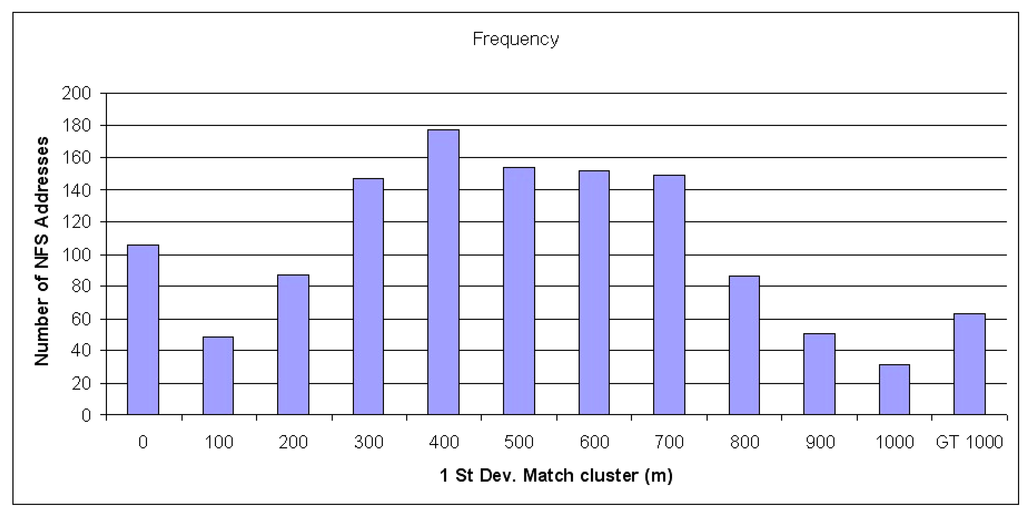 Figure 3 shows the distribution of 1 standard deviation cluster sizes. The average cluster of GD buildings associated with a NFS address has a standard deviation from the mean of 475 m. This implies that the automatic geo-coding method described here has an inherent precision of 1 km. This is adequate for environmental/climate studies being undertaken.