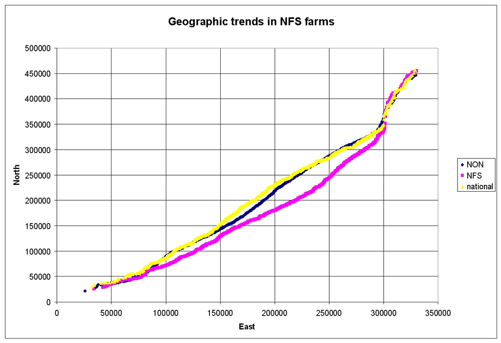 This plot has to be interpreted carefully. As can be seen the National random set (yellow) has a very similar spatial distribution to the NON NFS farm points (blue). The pink NFS points are distinctly different. The plot is read as increasing east left to right and increasing North bottom to top. So the kink in the top right hand quadrant is a caused by the lack of points in Northern Ireland and is interpreted as above 350,000N the points sampled are tending westward (County Donegal). This should help in interpreting the NFS data points. We can see, as the pink bulges below the national trend, that the GNFS points trend both more easterly and southerly than the national and non-nfs sets.