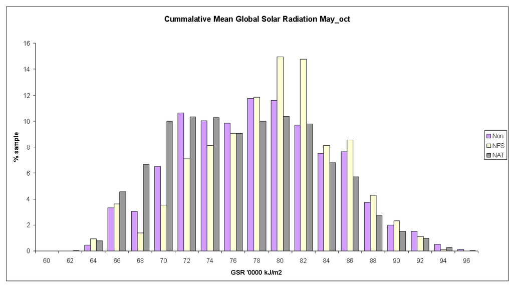 Figure 5 shows the distribution of values of the annual average accumulated summer GSR for the three test sets, national, NON-NFS and NFS. In this case the national set is the values for all the grid cells in the ROI map (every fourth value, 5,240 in total).