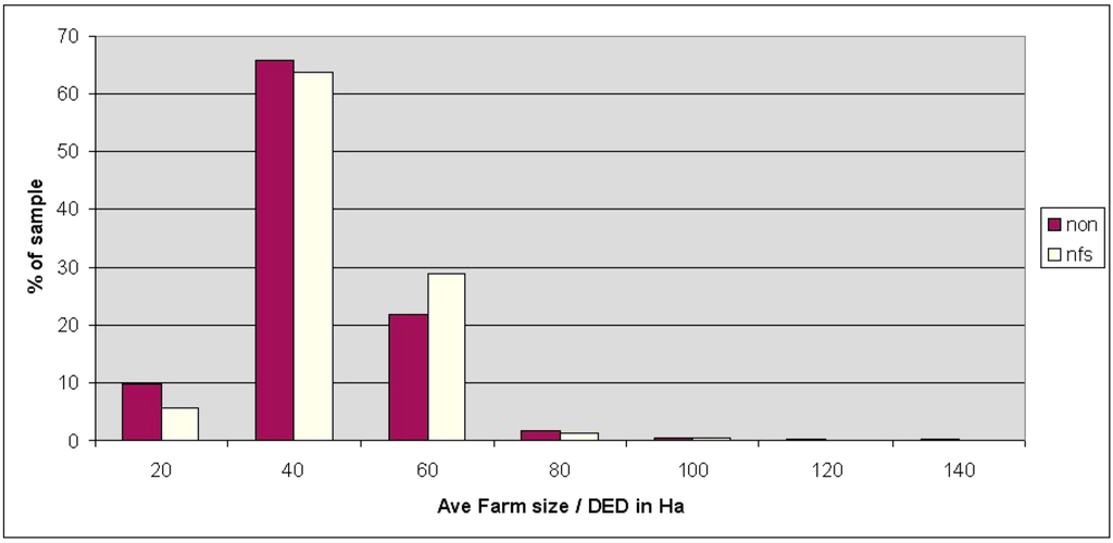 Figure 6 shows the frequency histogram of average farm size within NFS Districts and NON NFS Farm Districts. As we can see the distributions are similar (though the NFS has a slight skew toward larger farms). This is not unexpected as the selection of farms is matched against CSO census data.
