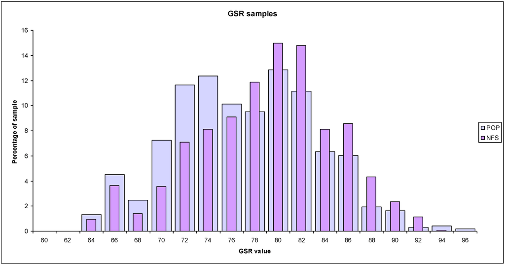 Is the skewing significant? The samples here are very large compared to the national sample (1,260 to 5,200) and thus tests based on the mean could give an erroneous impression. Examining the plots draws us to the hypothesis that the standard distribution of GSR values in the NFS sample is significantly different to the national set. To test, a two-sided F-Test was applied to both the National vs. Non NFS samples sets and the National vs. NFS sample sets.