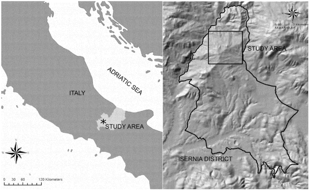 Map showing the Isernia district (Italy) and the location of the study area.