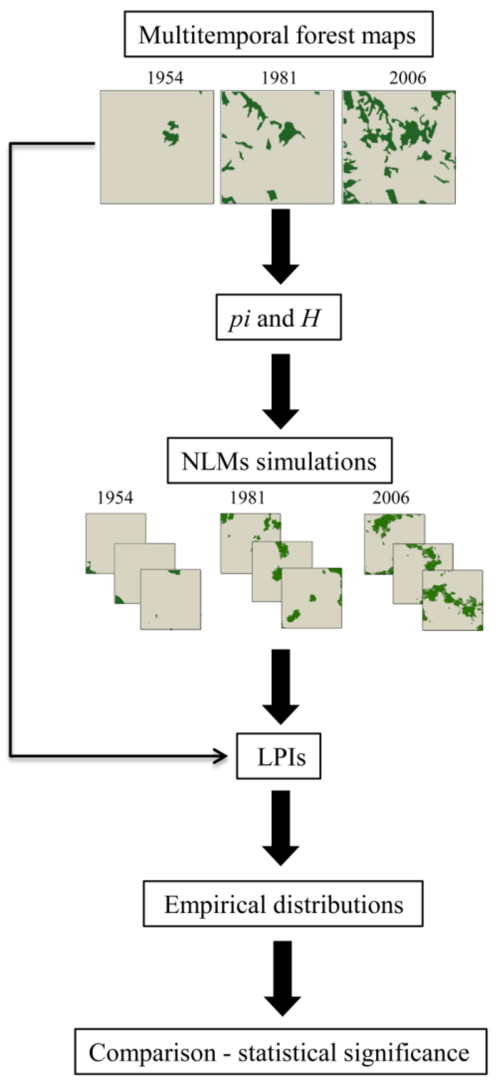Several studies attempt to describe changes in the spatial patterns of forests over time, resorting to the comparison of landscape pattern indices (LPI), but new methods for quantifying landscape differences in a statistical context are necessary. In this paper, we quantified and assessed the statistical significance of the forests pattern changes, which have occurred since the end of WWII in Central Italy (Isernia). To do this; based on the proportion of forest cover (pi) and contagion (H) of three land cover maps (1954–1981–2006); we generated 100 forest maps with predictable results through the midpoint displacement algorithm. Then, for both observed and simulated maps, we computed a set of LPI (number of patches, cohesion, largest forest patch index and area weighted mean shape index) and we derived their empirical distributions; finally, we compared the empirical distributions using the non-parametric Kruskal-Wallis test. Our results show significant changes in the spatial pattern of forests and underline the process of natural forest re-growth, which, in the area, is constrained by “remnants” of traditional activities. The adopted approach could be extended to a large ensemble of landscapes and spatial scales and could become a standard procedure when comparing patterns in time.