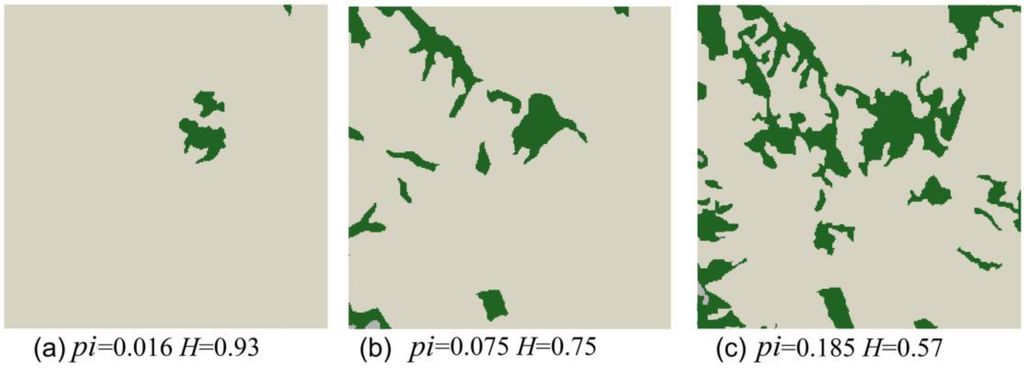 Three forest cover maps extracted from a multitemporal dataset of Isernia, Italy. Each image is 256 × 256 pixels, with a spatial resolution of 10 m. The binary classification separates oak forest (dark green) from other cover types (arable land, permanent crops, pastures, shrub and herbaceous vegetation—soft grey). pi indicates the proportion of forest cover; H is the autocorrelation of the map. (a) = 1954; (b) = 1981; (c) = 2006.