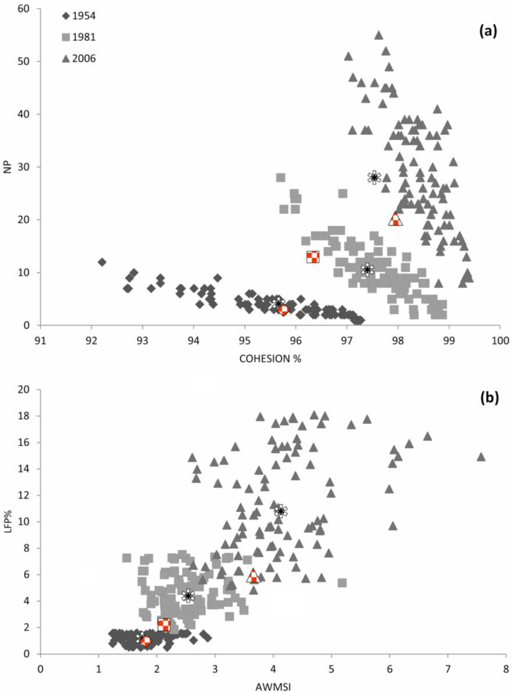 Scatter plots among two paired combinations of observed landscape pattern indices (LPI) values for simulated landscapes (N = 100; 1954, 1981 and 2006): (a) total number of patches of forest (NP) vs. COHESION and (b) LFP vs. weighted mean shape index (AWMSI). Asterisks indicate the mean values, and red symbols show the position of real landscapes within the empirical distribution derived from simulated landscapes (in grey scale).