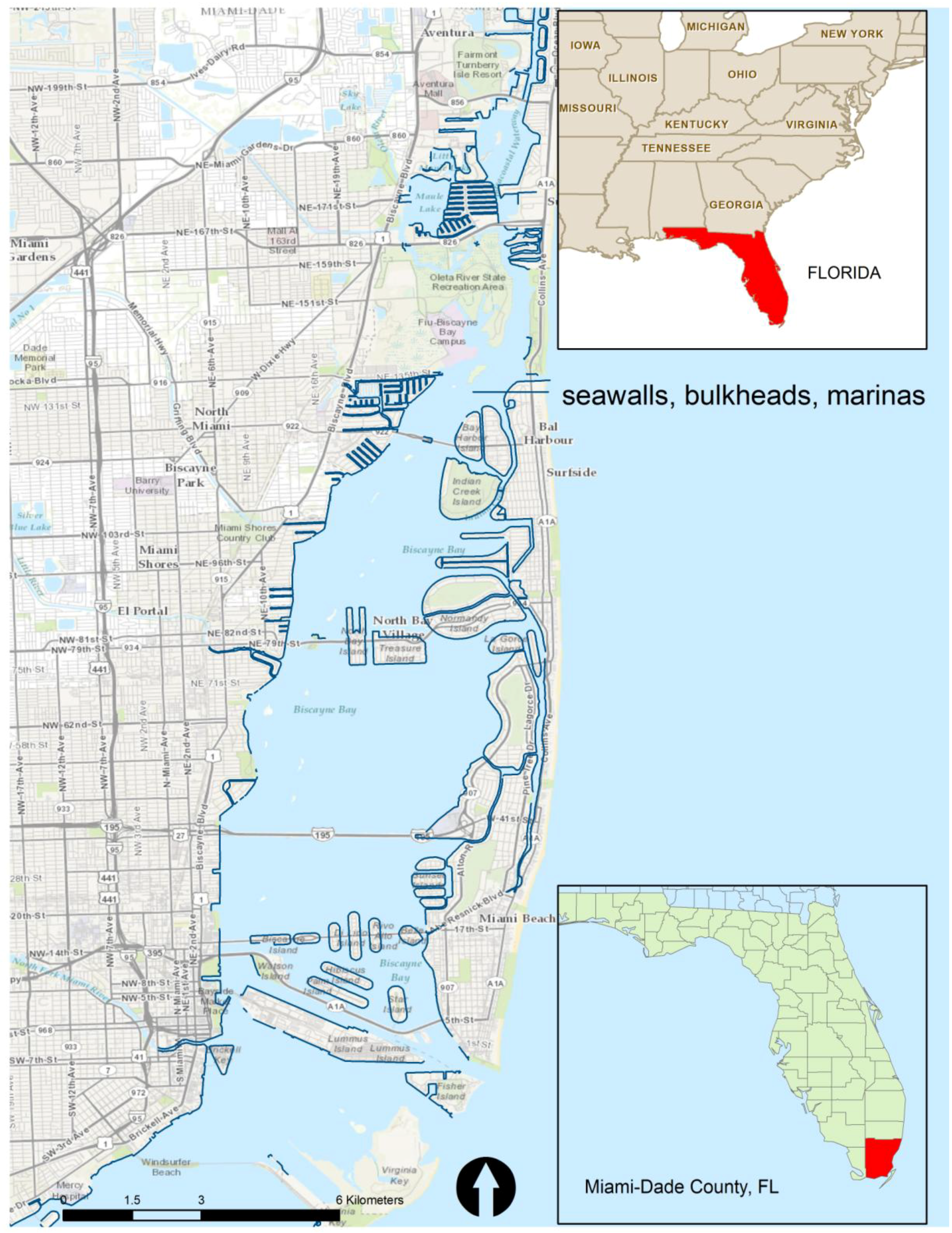 Our pilot study area focused on north Miami-Dade County, which is one of the most densely populated areas in South Florida that is vulnerable to coastal hazards, including erosion, storm damage and sea-level rise. According to the 2010 Census data, the average population density in Miami-Dade is 1,283 persons per square mile, much higher than the national average of 87 persons per square mile and the average for the State of Florida (349 persons per square mile). In the past few decades, a considerable amount of commercial and residential development occurred in the North Miami-Dade shore zone, resulting in some of the highest amounts of taxable value along the coast and the second highest population to shoreline length ratio in the State of Florida [21]. The area is also one of the most vulnerable to hurricane strikes.