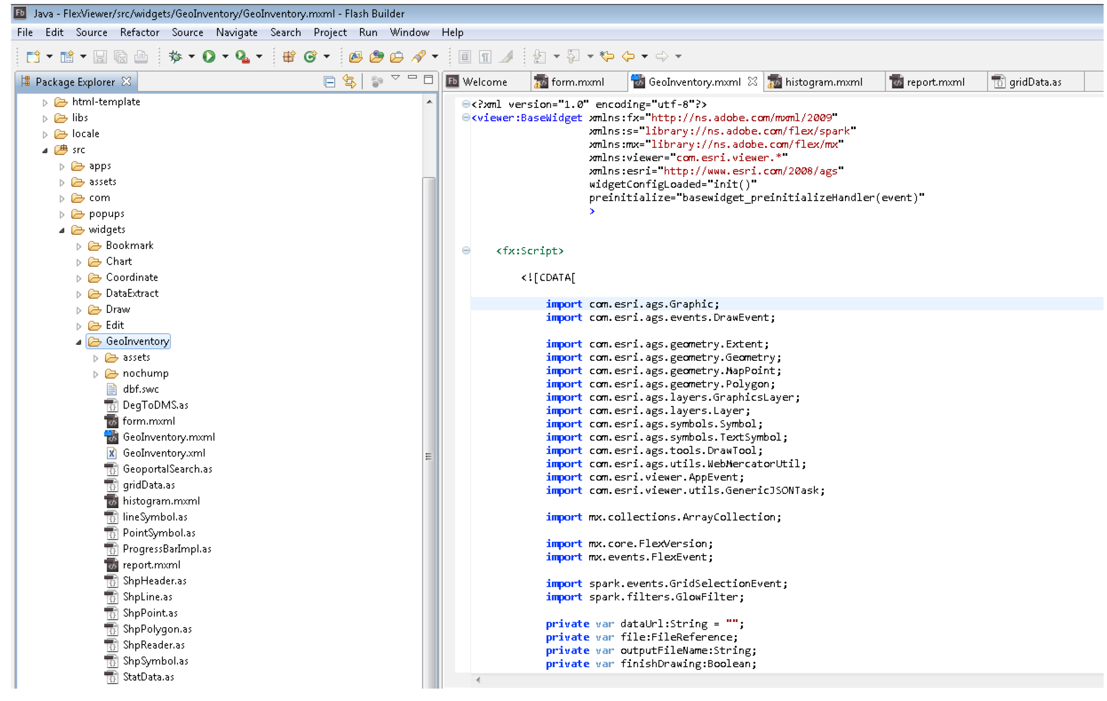 The functionally of the ArcGIS Viewer for Flex was extended by creating a customized GeoInventory widget to allow users to query and upload shapefiles. The Geoportal web application file organization stores the CS-W service definition information and contains the ArcGIS Viewer for Flex mapping application with capabilities for search and display of geographical data. The GeoInventory widget parses shoreline data stored in ESRI shapefile format. The original shapefiles must be re-projected to WGS_1984 geographic coordinate system and stored in a single zip file before they are processed by the GeoInventory widget tool. Using the GeoInventory widget, the zipped shapefile data is retrieved and uploaded. The widget allows uploads from (a) search results in the internal database described in a Metafile created by invoking the Geoportal XML Editor (GXE) software module; and (2) user-generated content in a zipped shapefile format. The GeoInventory widget tool displays the geometrical location data to the map viewer. In addition, portable code blocks were reused based on shapefile code. The following code was developed for this project: GeoInventory/GeoInventory.mxml; GeoInventory/Form.mxml; GeoInventory/Histogram.mxml; GeoInventory/Report.mxml; GeoInventory/ProgressBarImpl.as; GeoInventory/GeoportalSearch.as; GeoInventory/gridData.as; GeoInventory/StatData.as. For this project, the geoInventory widget (exported from Adobe Flashbuilder as GeoInventory.swf) was added in <Apache Software Foundation path>\Tomcat 7.0\webapps\geoportal\viewer\config.xml. Figure 4 illustrates the programming code customization process for the GeoInventory widget.