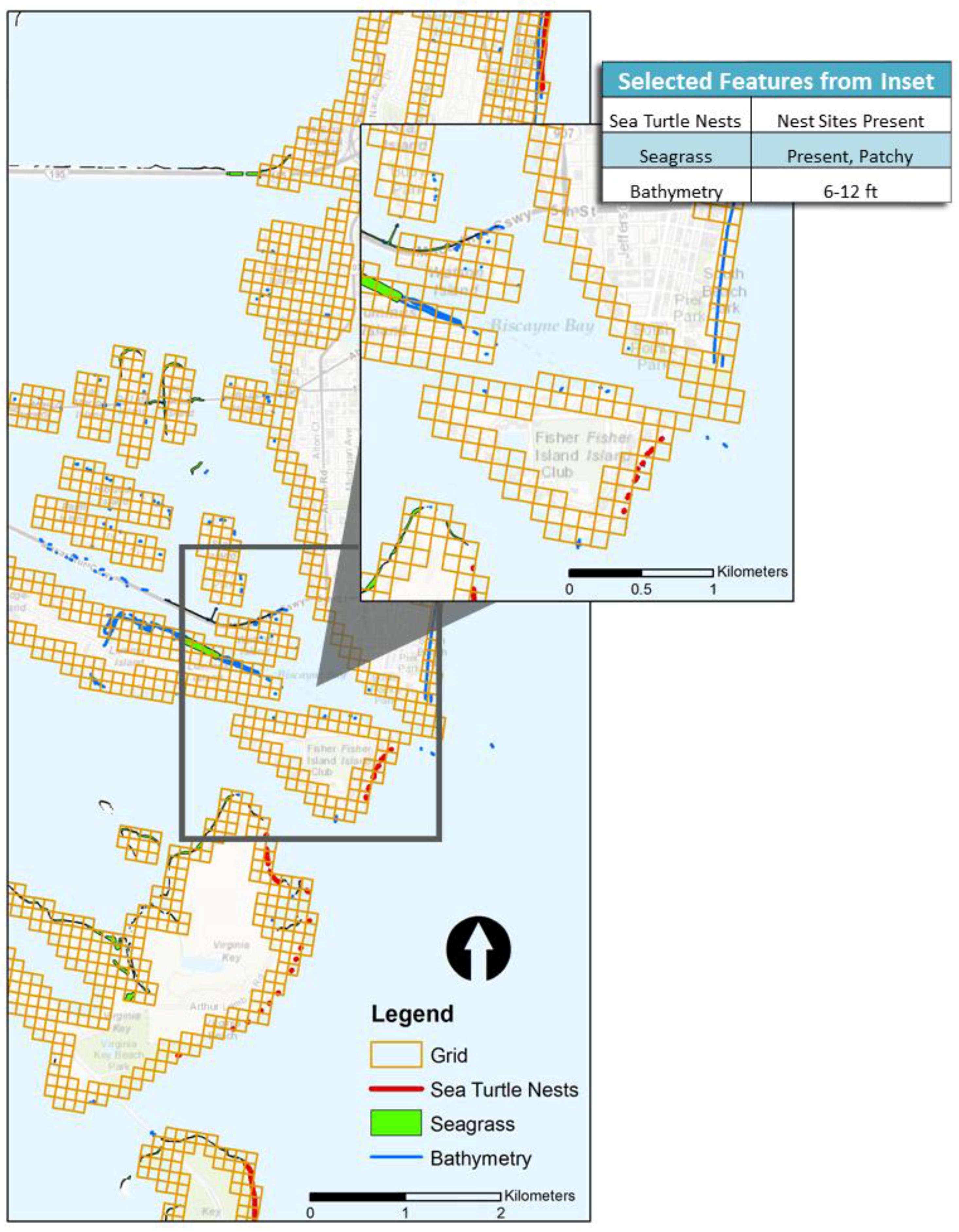 In addition, we intersected selected layers in Table 1 to create a vector grid with a resolution of 100 m × 100 m. Data processing was carried out using the geoprocessing tools in ESRI’s ArcMap and ArcCatalog and re-projected to a common coordinate system (Albers Conical Equal Area). The attribute table of the grid includes information on level of urbanization, coastal protection measures, substrate, bank condition, bathymetry, beach presence, marsh presence, vegetation, turtle nesting sites, mangrove strands, etc. This database can be queried for important information to provide the user with rapid summary reports useful to proactively consider future coastline development and assess the regional cumulative effect of lost connectivity between the coast and reef and offshore marine ecosystems. For example, a user can select several cells from the grid and generate a summary report with information on various attributes, such as dominant vegetation species, average bathymetry, presence/absence of sea turtle nesting sites, etc. The tool may also help identify and classify management options for high-medium and low-energy wave shorelines or evaluate management options and provide science-based policy recommendations, including the viability of living shoreline treatments.