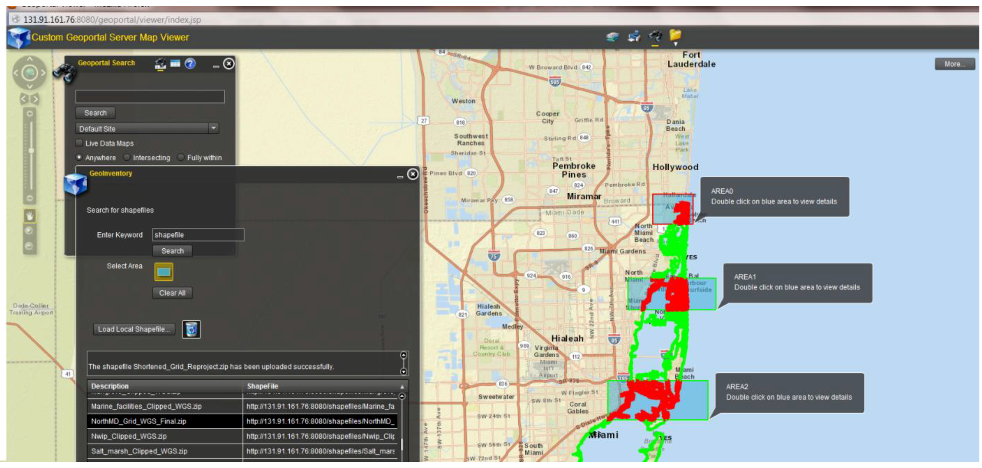 Building upon these conceptual frameworks, initiatives and applications, we are developing a geospatial inventory tool that will guide habitat conservation, restoration and coastal development and benefit several stakeholders who seek mitigation and adaptation strategies to shoreline changes resulting from erosion and sea level rise. We use the ESRI Geoportal Server, an open source geospatial resources management software first released by ESRI in 2010. Its latest version 1.2.2, released in July 2012, employs a collection of software modules and components to allow users to search and access geospatial information stored in a central repository [20]. This flexible web-based framework renders itself customizable to display map data and build query functions. Examples of customized geoportals include Geospatial One-Stop (https://explore.data.gov/), USEPA Environmental Dataset Gateway (edg.epa.gov), NOAA National Climatic Data Center (gis.ncdc.noaa.gov), Kentucky Geographic Network (http://kygeonet.ky.gov/) and Montana GIS Portal (gisportal.msl.mt.gov).