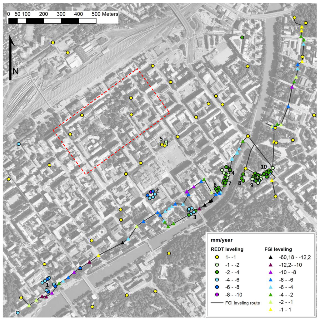 The REDT leveling data subsidence rates for a certain building part were very similar, thus, the leveling observations could be converted to mean annual subsidence velocity of the building or a part of a large building. It is also more convenient to relate the geocoded PSs to larger objects, e.g., a part of a building. The building data of the digital city base map was used in identifying the corresponding radar scatterers of certain buildings. The REDT observations were digitized on the base map. An overlay analysis of the leveling and SAR datasets was carried out. In order to compare the REDT leveling results and the PSI results, the mean annual deformation rates were calculated for different buildings or building parts. For the mean annual rates, all of the PS within building borders (or less than 2 m from border) were used.