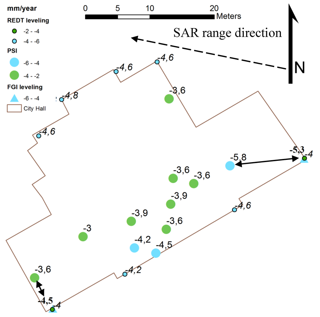 Historical SAR data are available, but ground truth data from the same period is usually difficult to find. Fortunately for this case study, a longer leveling time series was available for some of the buildings from the City’s Real Estate Department. The FGI’s leveling covers only a one-year period from 2005 to 2006. The FGI subsidence rates used in the analyses ranged from 0.15 to −14.1 mm/yr. In the PSI results (near the leveling sites), subsidence rates ranged from +5.5 to −9.7 mm/yr and the PSI values used in the analyses ranged from 0.6 to −8.5 mm/yr. In the PSI analysis, the entire SAR time series from 1992 to 2006 was used in order to ensure that there were enough images to obtain reliable results. Thus, there are large temporal differences in the datasets. Since the City’s leveling data also indicated fairly constant subsidence rates for the benchmarks, the subsidence rate was assumed constant in order to compare the FGI’s leveling and the PSI measurements. In the REDT long leveling time series, the deviation from linear subsidence was less than 1 mm, which was the same order of magnitude as the measurement error. However, it is likely that some buildings have discrepancies due to renovation works, etc., and so some errors are inevitable.