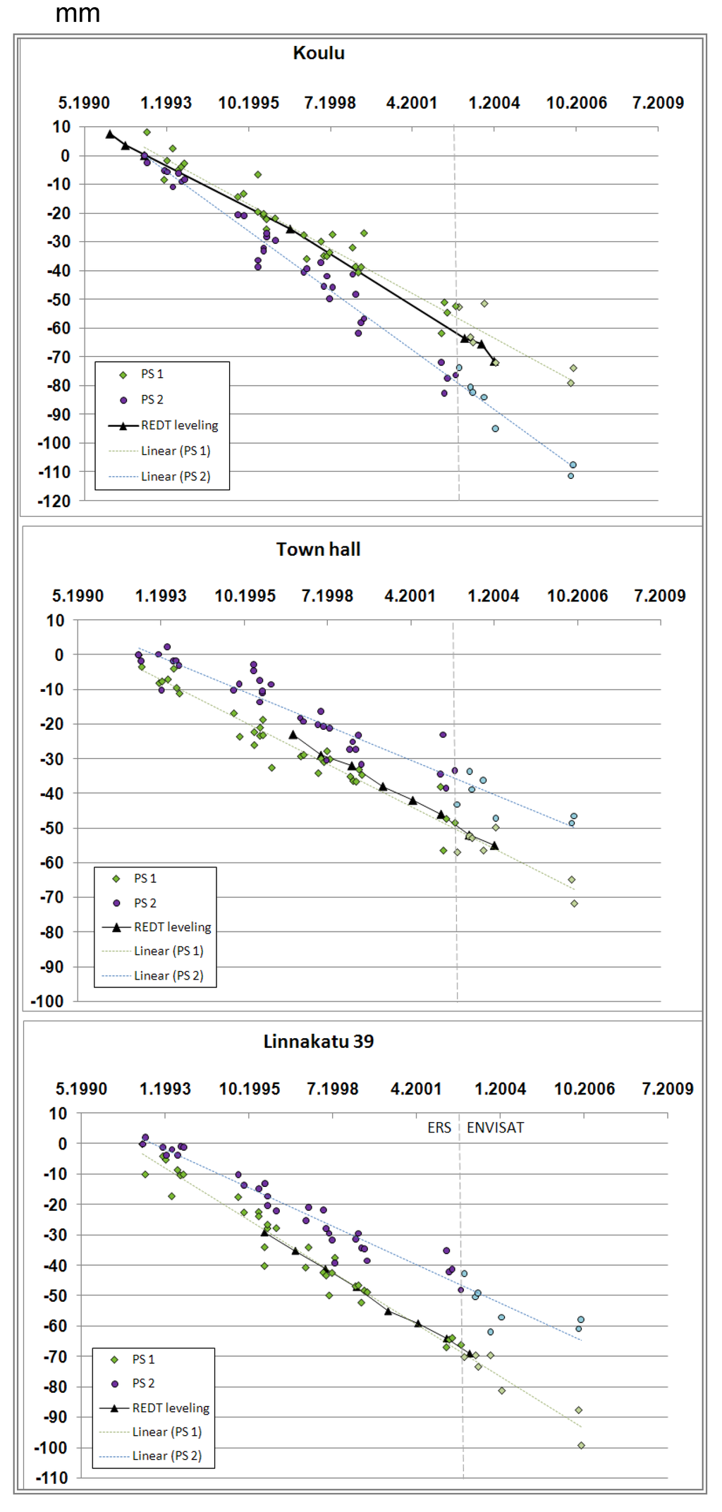 Six PSI time series are plotted against three REDT leveling time series in Figure 7. Single observations have remarkable phase noise and are unreliable, however, on average, good results can be obtained. The average deformation rates vary from PS to PS, and only few match perfectly with the leveling time series. PS deformation rates differences to linear model based on leveling data are presented in Table 6. Even though, the ENVISAT time series is short and thus, lower accuracy can be expected as a result of higher deviation of deformation values (average difference from linear PSI model is 3.2 for ERS and 4.0 for Envisat, Table 6), the observations can be combined with the ERS time series.