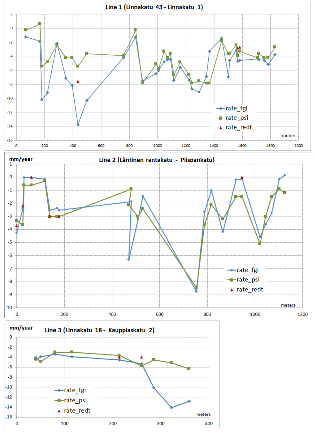 In addition, the FGI leveling observations along three leveling lines were compared to PSI observations (Figure 9). The trends are similar; however the rate of subsidence varies. Average absolute value of the difference was 1.6 mm/yr (Line1 1.8, Line2 0.9 and Line3 2.8 mm/yr). This is also likely caused by the observations referring to different buildings or other objects and they also cover different periods of time.