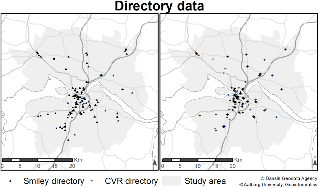 The addresses in CVR were geocoded based on address reference data in the Universal Transverse Mercator (UTM) projection obtained from the Danish Geodata Agency. The Smiley register contains WGS84 (World Geodetic System 84) coordinates for approximately 95% of entries, which are transformed to UTM and used as their locations. The remaining records are geocoded through the use of the address and reference data from the Danish Geodata Agency. The distribution of the Smiley and CVR directory entries is visualized in Figure 1.