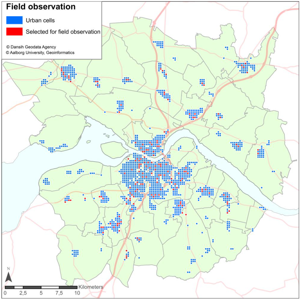 The method for field observation was adopted from Toft et al. [18]. The study area was divided into cells of 250 × 250 m through the use of the standard Danish Grid Cell system. Four hundred and ninety-seven grid cells contain records from the Smiley register and CVR. A random sample of 125 cells was selected from the 497 cells for field observation. An additional 35 cells were selected to search for unlisted food retailers in cells that, based on population, could possibly support the existence of a food retailer. To fulfill this, the 35 cells had to follow these three criteria: the cell contains no records in Smiley or CVR; a minimum of 10 addresses from the address reference data are located in the cell; and a minimum of two neighboring (queen’s rule) cells have a minimum of 10 addresses. The selected and populated (following the criteria) cells are illustrated in Figure 2. The selected cells were approximately divided into 50% located in the metropolitan area of Aalborg and 50% located in the rural areas surrounding Aalborg.