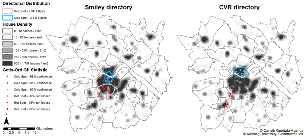 The distribution of the clusters was analyzed to determine whether the clusters are located in urban or rural areas. The analysis was conducted in the software ArcGIS Desktop 10.2 by ESRI using optimized hot spot analysis (Getis-Ord Gi* Statistic) from the Spatial Statistics package. In Figure 3, the results are visualized. The clusters with low values (cold spots) are for both Smiley and CVR located in the central part of Aalborg, whereas the clusters with high values are located in the sub-urban/rural areas for Smiley and in rural areas for CVR.