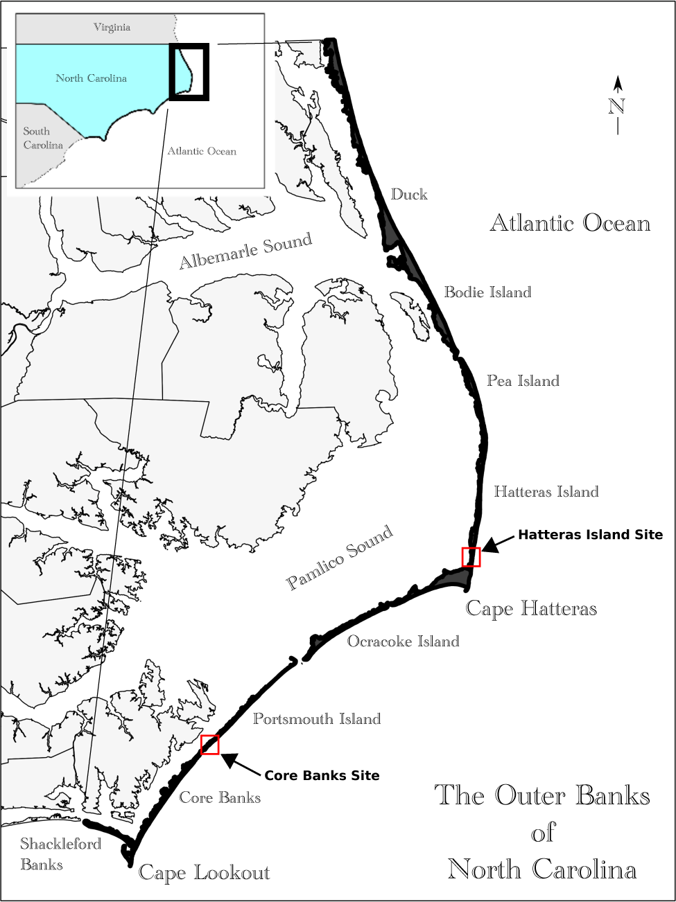 The first island site chosen (refer to Figures 1 and 2) is a two kilometer section located at the southern end of the Outer Banks on Core Banks. Core Banks extends for 72 km between Cape Lookout and Ocracoke Inlet. It was selected for this research for its lack of human-influenced morphology. The barrier island is undeveloped, with no paved roads, little large-scale human modification and no permanent human habitation. Core Banks is considered to be a natural barrier island system [25].