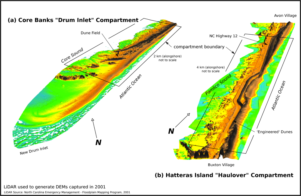 Five (LiDAR) datasets were downloaded from NOAA’s Coastal Service Center, each for the Core Banks and Hatteras Island study sites along North Carolina’s Outer Banks. The series for the Core Banks location include data from 1997, 2001 and 2005. For Hatteras Island, LiDAR captured in 1996, 2001 and 2009 was obtained.