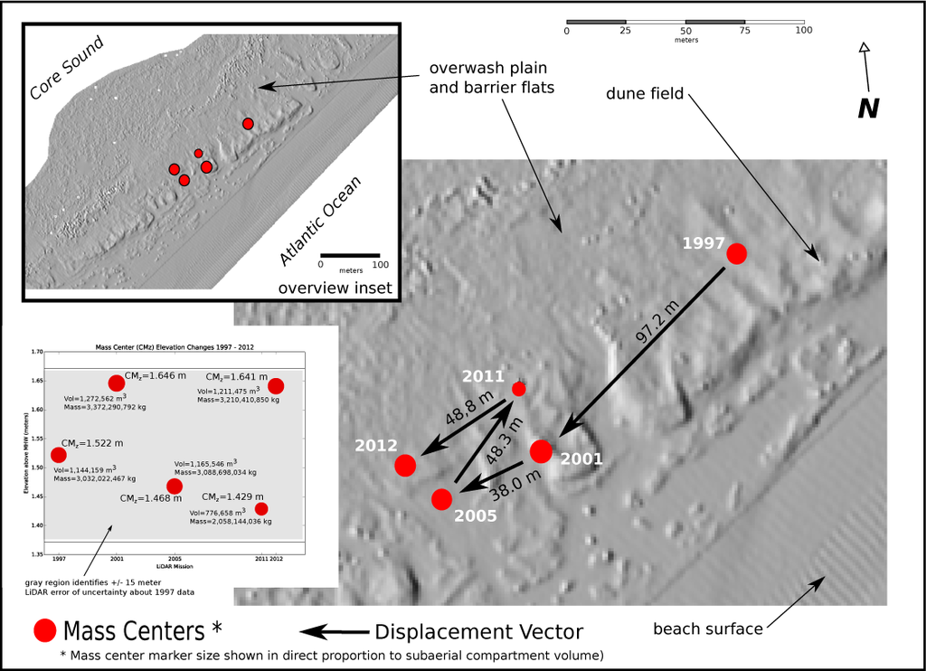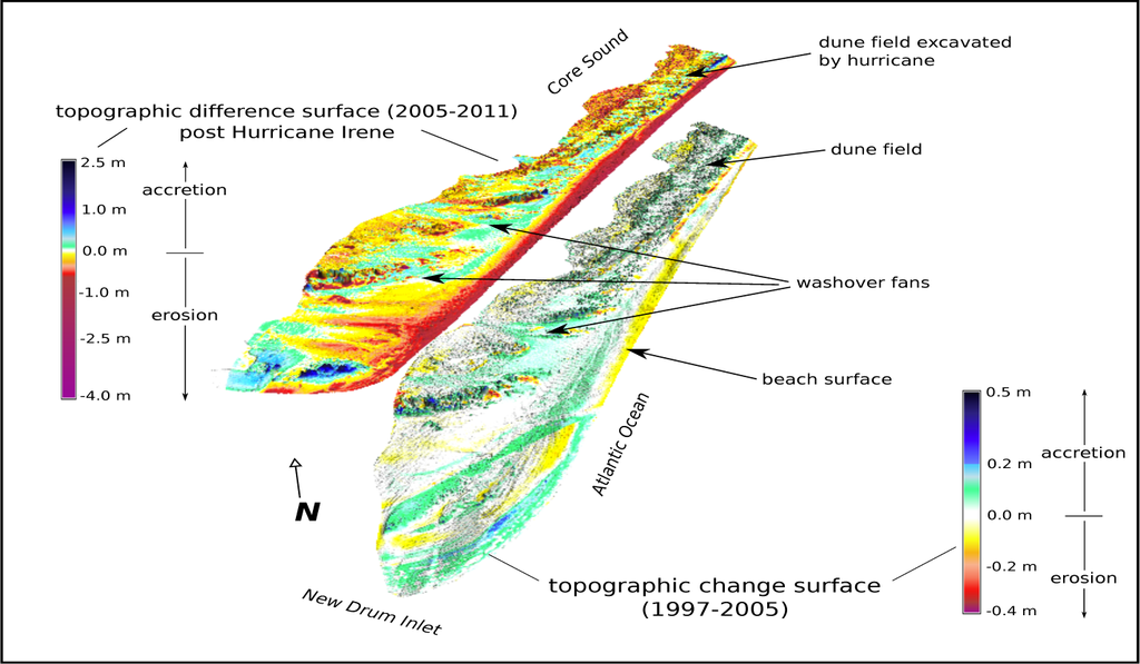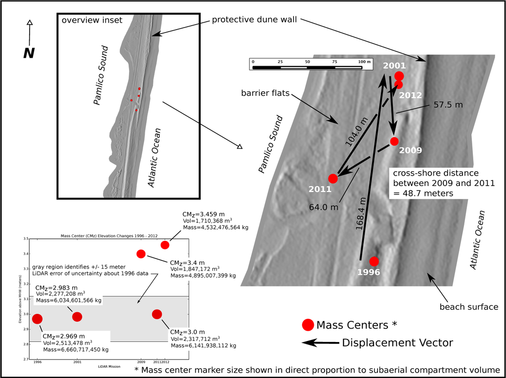 Two additional LiDAR datasets were also acquired for both study sites. The first was captured following Hurricane Irene’s landfall in August 2011. Irene crossed the North Carolina coast near Cape Lookout on 27 August 2011. The post-Irene flight was conducted on 28 and 29 August. A second post-storm mission from 2012 in association with Hurricane Sandy, which impacted the Outer Banks in late October 2012, was also included. Both post-hurricane compilations are included here to provide some limited insights into how the island systems responds to a high energy storm event, as well as to test the response of the island mass center metric to such events.